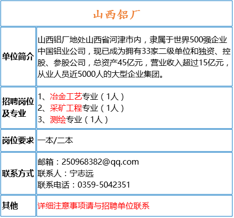 要求:本科及以上學(xué)歷,冶金工程或相關(guān)專(zhuān)業(yè);熟悉鋁冶煉工藝,具有相關(guān)實(shí)踐經(jīng)驗;具備團隊協(xié)作能力和問(wèn)題解決能力。